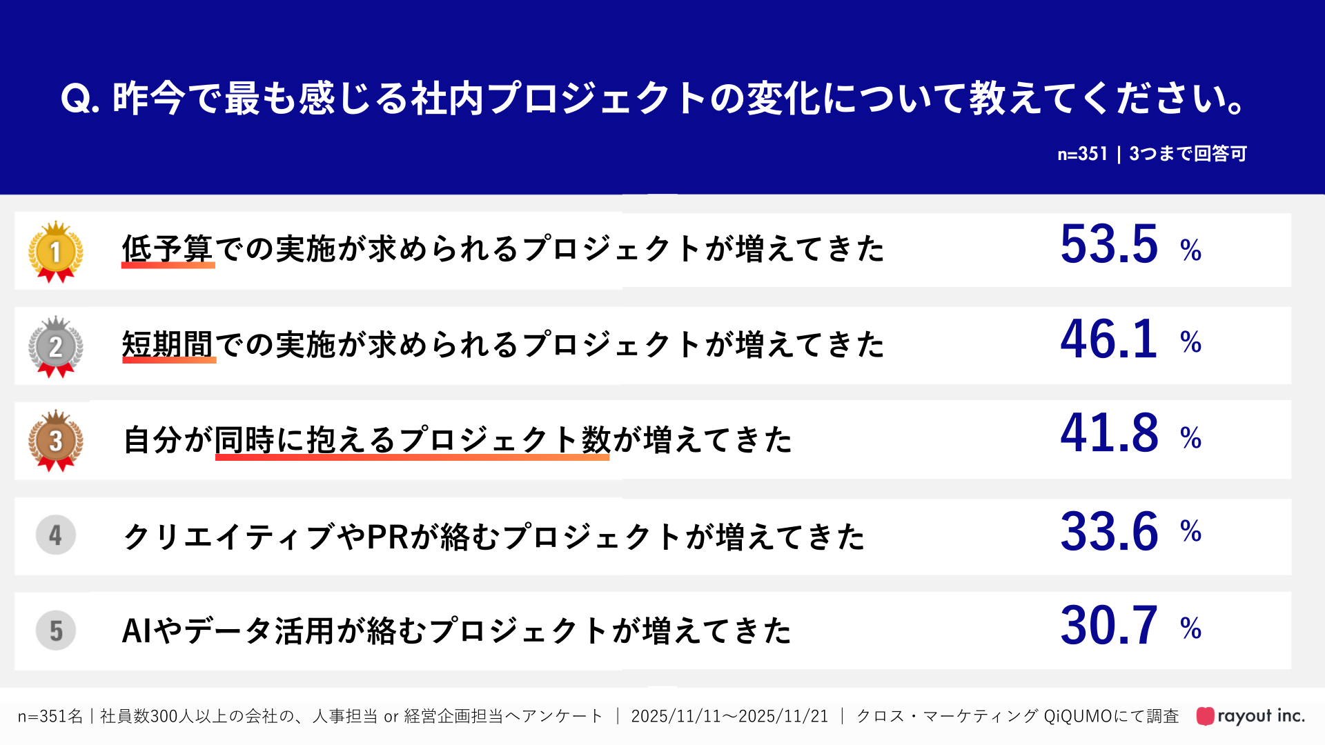 2025 年11月に当社で実施した「プロジェクト推進に関するアンケート調査」(n=351、社員数300 人以上の企業の人事担当/経営企画担当、クロス・マーケティング QiQUMO にて調査)でも、昨今の社内プロジェクトの変化として、「低予算での実施が求められるプロジェクトが増えてきた」(53.5%)が最多となり、次いで「短期間での実施が求められるプロジェクトが増えてきた」(46.1%)、「自分が同時に抱えるプロジェクト数が増えてきた」(41.8%)が続いています。