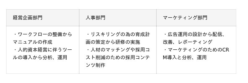 - 課題に応じた人材のアサインメント: 人事課題・採用課題・マーケティング課題・DX課題など、顧客の課題に応じて知見やナレッジがあるPMがアサインされる。