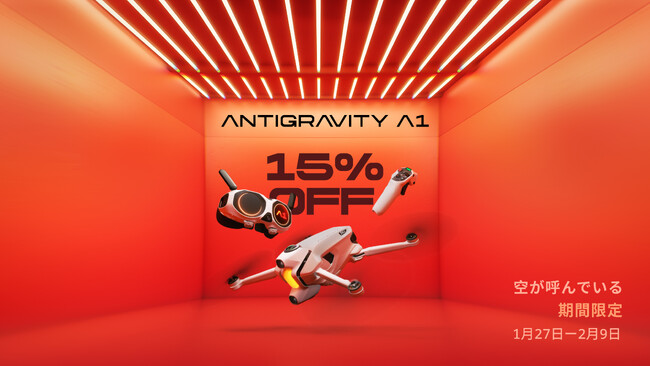(2026年1月27日)Insta360の支援を受け、ドローン愛好家とエンジニアからなるチームによって設立されたAntigravityは、没入型8K360度全景ドローン「Antigravity A1」に操縦スキルの習得を支援する新機能「フライトシミュレーター」を導入いたします。 本アップデートを記念し、2026年1月27日(火)17:00~2026年2月9日(月)16:59の期間、Antigravity A1が15%OFFとなる期間限定オファーを実施いたします。