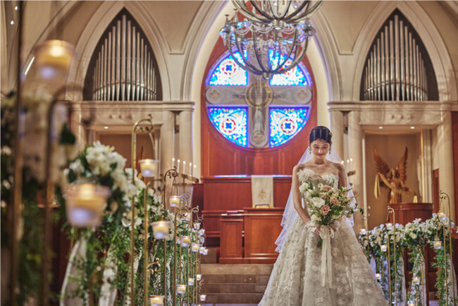 大聖堂は、20mの大理石のバージンロードやステンドグラスなど、空間そのものが印象的な設計。写真・映像の雰囲気も含めて、ゲスト目線で体感いただけます。