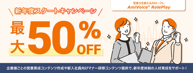 株式会社アドバンスト・メディア(本社:東京都豊島区、代表取締役会長兼社長:鈴木清幸 以下、アドバンスト・メディア)は、AIを活用したセルフトレーニングプラットフォーム「AmiVoice RolePlay(アミボイス ロールプレイ)」を、最大50%OFFでお得にご利用いただける新年度スタートキャンペーンを開催いたします。