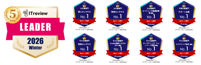 また、MAツール部門の大企業部門では3項目でNo.1を獲得(導入のしやすさ、管理のしやすさ、オフライン行動履歴管理機能)、中堅企業部門では1項目でNo.1を獲得(サポート品質)、中小企業部門では4項目でNo.1を獲得(管理のしやすさ、Cookie情報とのひも付け機能、ターゲティング、キャンペーン管理機能、スコアリング設定機能)しています。