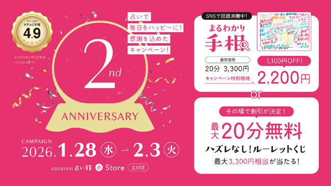 ザッパラスグループの株式会社cocoloni(本社:東京都渋谷区、代表取締役:溝上雅俊)が運営する占いの店『cocoloni占い館』立川店が、2026年1月28日(水)に2周年を迎えました。それを記念して2026年1月28日(水)より2周年キャンペーンを開催いたします。
