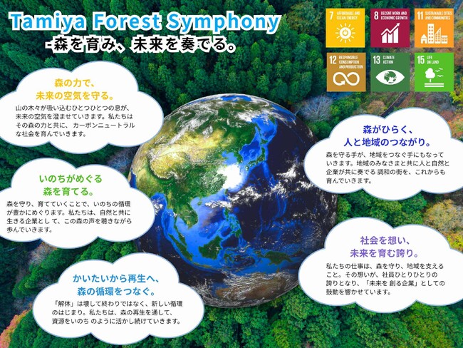 「都市で木を扱い、壊す」責任を持つ企業として、その上流にある「森を育む」プロセスに自ら関与することで、資源の循環(シンフォニー)を奏でる。それが「Tamiya Forest Symphony」の思想です。