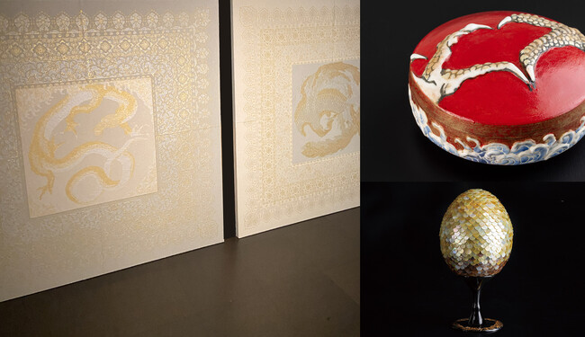 漆芸作家の島本恵未は、「龍」からインスピレーションを受け、独自のアイディアと繊細な技法によって、龍の卵をイメージした螺鈿作品を仕上げました。