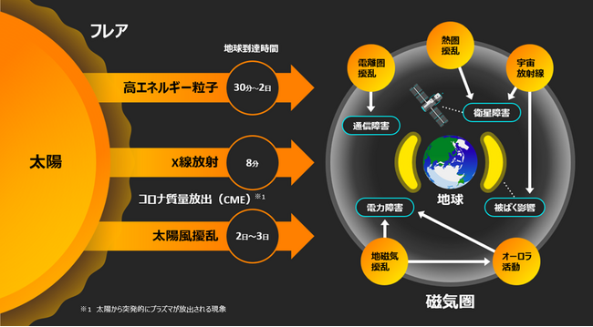 太陽表面で発生するフレア(注5)やコロナ質量放出(CME)(注6)などの太陽活動は、地上インフラに対して、通信障害、電離圏攪乱(注7)によるGPS精度低下、送電網の電流増大など、社会生活に影響を及ぼすことが知られています。