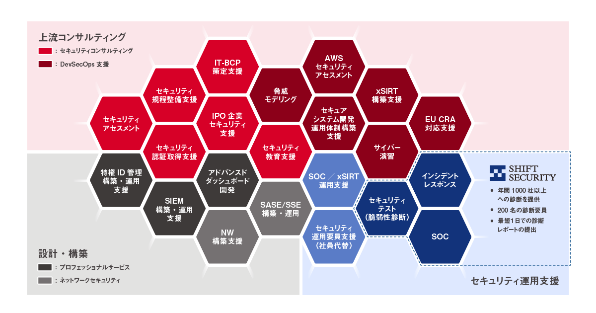 SHIFTは、2020年にセキュリティ事業を開始して以来、祖業である品質保証事業で培った業界知見や、グループ横断の幅広いシステム運用・技術ナレッジを組み合わせることで、セキュリティの上流から下流までを包括的にカバーする幅広いソリューションの提供を進めてきました。また、ネットワーク構築・運用支援のソリューション展開も本格化し、2025年には専門部署を立ち上げるまでに急成長を遂げています。