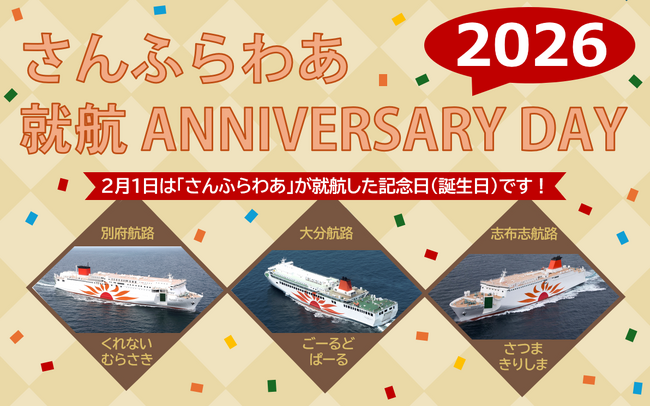 株式会社商船三井さんふらわあ(代表取締役:牛奥 博俊)は、長年にわたる「さんふらわあ」へのご愛顧に感謝の意を込め、2026年2月1日(日)に大阪/別府航路、大分/神戸航路、大阪/志布志航路において、「さんふらわあ就航アニバーサリーデー2026」を実施いたします。