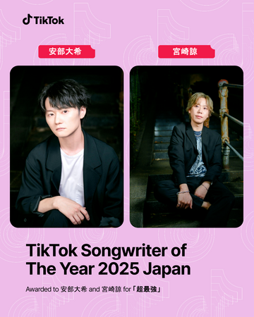 ショートムービープラットフォーム「TikTok(ティックトック)」は、その年を代表する現地のトップソングライターを表彰する「TikTok Songwriter of The Year 2025」を発表しました。日本からは、2025年にTikTokで大きな話題を集めた楽曲、超ときめき(ハート)宣伝部「超最強」を手がけた安部大希、宮崎諒が受賞者に決定しました。