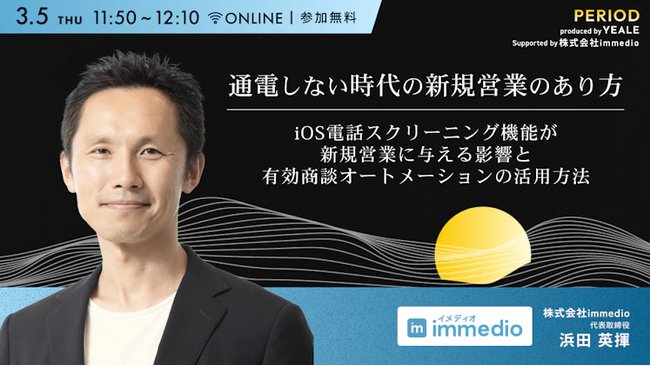 株式会社immedio(本社:東京都、代表取締役:浜田英揮)は、株式会社セレブリックスが運営するカンファレンス「PERIOD. 新規営業の『常識』をアップデートせよ」において、iOS電話スクリーニング機能の普及によって変化する新規営業の環境をテーマに登壇します。