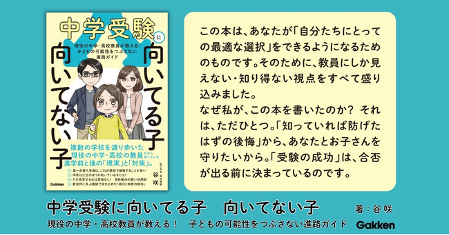 [画像4: https://prcdn.freetls.fastly.net/release_image/2535/8599/2535-8599-82b7df09ed603a68653f072c89f53483-749x1100.jpg?width=536&quality=85%2C75&format=jpeg&auto=webp&fit=bounds&bg-color=fff ]『中学受験に向いてる子 向いてない子 現役の中学・高校教員が教える! 子どもの可能性をつぶさない進路ガイド』
