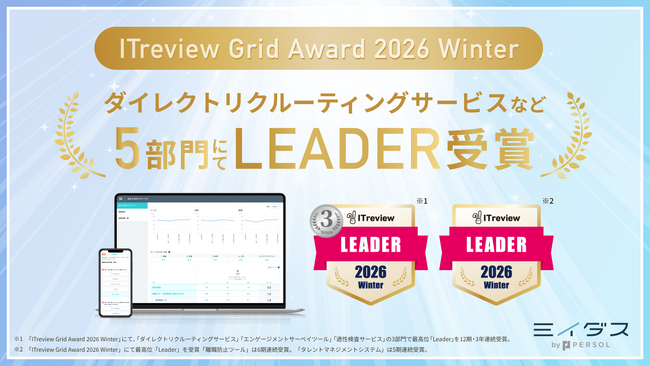 「はたらいて、笑おう。」をビジョンに掲げるパーソルグループの中途採用サービス『ミイダス』を運営するミイダス株式会社(本社:東京都渋谷区、代表取締役社長:後藤 喜悦)は、アイティクラウド株式会社(本社:東京都港区、代表取締役社長兼CEO 黒野 源太)が主催する「ITreview Grid Award 2026 Winter」にて、5部門で最高位の「Leader」を受賞しました。