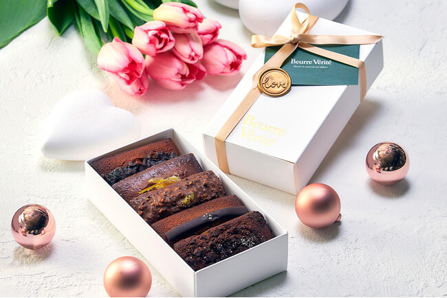 Beurre Verite自慢のシグネチャーの「焼き立てフィナンシェ」。バレンタイン限定でご用意した、5種のチョコレートフレーバーを詰め合わせました。大切な方への想いを伝えるギフトにふさわしい、特別なフィナンシェアソートです。