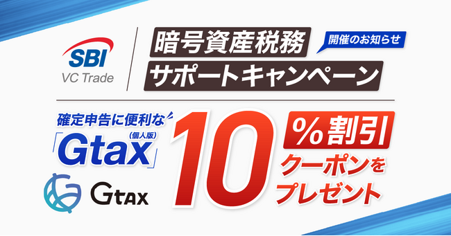 SBIホールディングス株式会社(本社:東京都港区、代表取締役会長兼社長:北尾 吉孝)の連結子会社で暗号資産交換業を営むSBI VCトレード株式会社(本社:東京都港区、代表取締役社長:近藤 智彦、以下「当社」)は、2026年1月29日(木)より、デジタルアセットの会計・税務・データ管理サービスを提供する株式会社Gtax(本社:東京都港区、代表取締役:岡田 佳祐、以下:Gtax社)と連携し、「暗号資産税務サポートキャンペーン~確定申告に便利な『Gtax(個人版)』10%割引クーポンをプレゼント~」を実施することをお知らせいたします。
