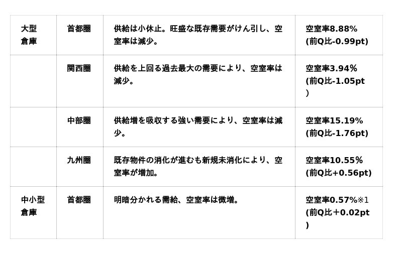 ※1 中小型倉庫については、本レポートより、一般社団法人 日本倉庫マスターリース協会の協会員企業が管理する倉庫物件データを用いて空室率を算出しています。なお、前Q分についても同データに基づき再算出しています。