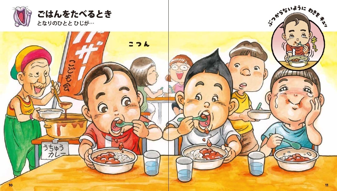 本書は右きき仕様が「当たり前」の中、さまざまな工夫や体験を重ねる左ききの少年を主人公に、「並んで食べるとき隣の人とひじがこつん!?」「スープバーのおたまが!?」「改札は体をひねってピッ!?」など左ききの日常をコミカルに描いた作品です。左ききのお子様や保護者はもちろん、右ききのお子様や保護者も共感できて「Yes!」と言いたくなる一冊に仕上がっております。