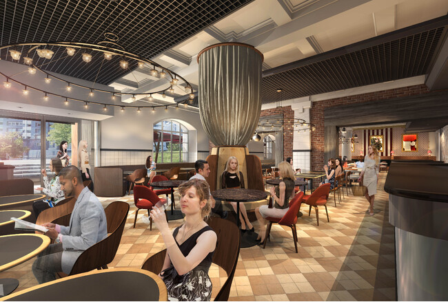 既存の円柱を活かしたシンボリックなベンチ、現代美術家・長島伊織氏の作品を引き立てるライティング、選び抜かれた家具やインテリアが調和。歴史ある建築と現代アートが響き合い、まるで100年の時空を旅するかのような、洗練と寛ぎが共存する社交場を創出しています。