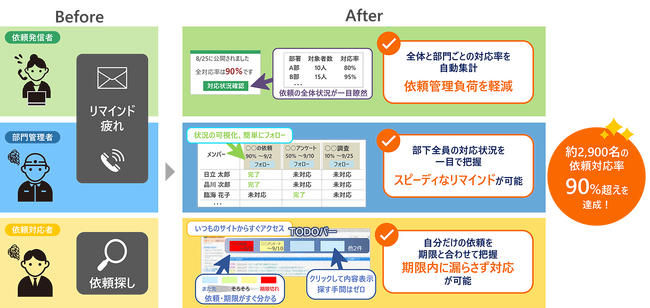 1.複数チャネルに分散していた社内依頼の方法を「グループタスク リマインダーサービス」に集約。依頼発信者が部門別の対応率や未対応者数、フォロー状況をタイムリーに把握でき、ワンクリックでフォローできる体制を構築