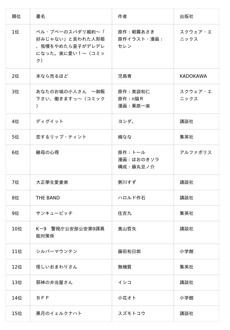 第1位『ベル・プペーのスパダリ婚約~「好みじゃない」と言われた人形姫、我慢をやめたら皇子がデレデレになった。実に愛い!~(コミック)』(原作:朝霧あさき 原作イラスト・漫画:セレン/スクウェア・エニックス)