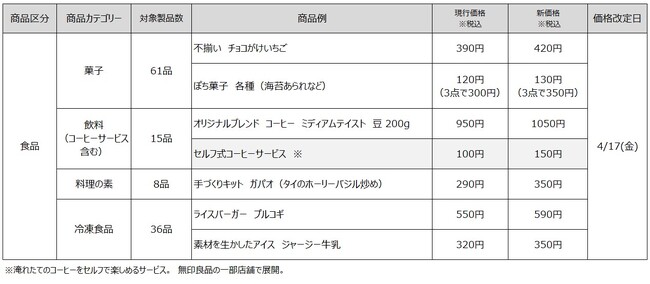 無印良品を展開する株式会社良品計画(東京都文京区/代表取締役社長 清水 智)は、4月17日(金)より、菓子を中心とした食品118品目、および一部店舗で展開しているセルフ式コーヒーサービスについて価格改定(値上げ)を実施します。
