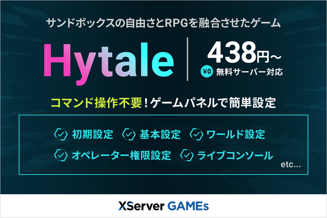 エックスサーバー株式会社(所在地:大阪市北区、代表取締役:小林 尚希)は、2026年1月29日、サーバー構築数7万件(※1)を超えるマルチプレイ専用ゲームサーバーサービス『XServer GAMEs』において、国内初(※2)となる、注目作「Hytale」に対応した完全無料のマルチプレイサーバーの提供を開始しました。あわせて、「Hytale」のマルチプレイをさらに快適にできる、「Hytale」専用のサーバー設定も同時提供しています。