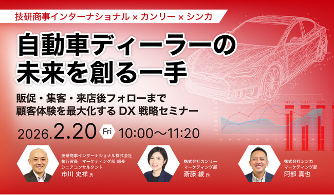 コミュニケーションプラットフォーム「カイクラ」の開発・販売を行う株式会社シンカ(本社:東京都千代田区、代表取締役社長CEO:江尻 高宏、以下「シンカ」)は、エリアマーケティングGIS(地図情報システム)の開発・販売を手掛ける技研商事インターナショナル株式会社(所在地:愛知県名古屋市、代表取締役:小嶌 智海、以下「技研商事インターナショナル」)、「カンリー店舗集客」の開発・提供を行う株式会社カンリー(所在地:東京都品川区、代表取締役:辰巳 衛/秋山 祐太朗、以下「カンリー」)と、自動車販売店の競争力を高める3社共催セミナーを開催いたします。