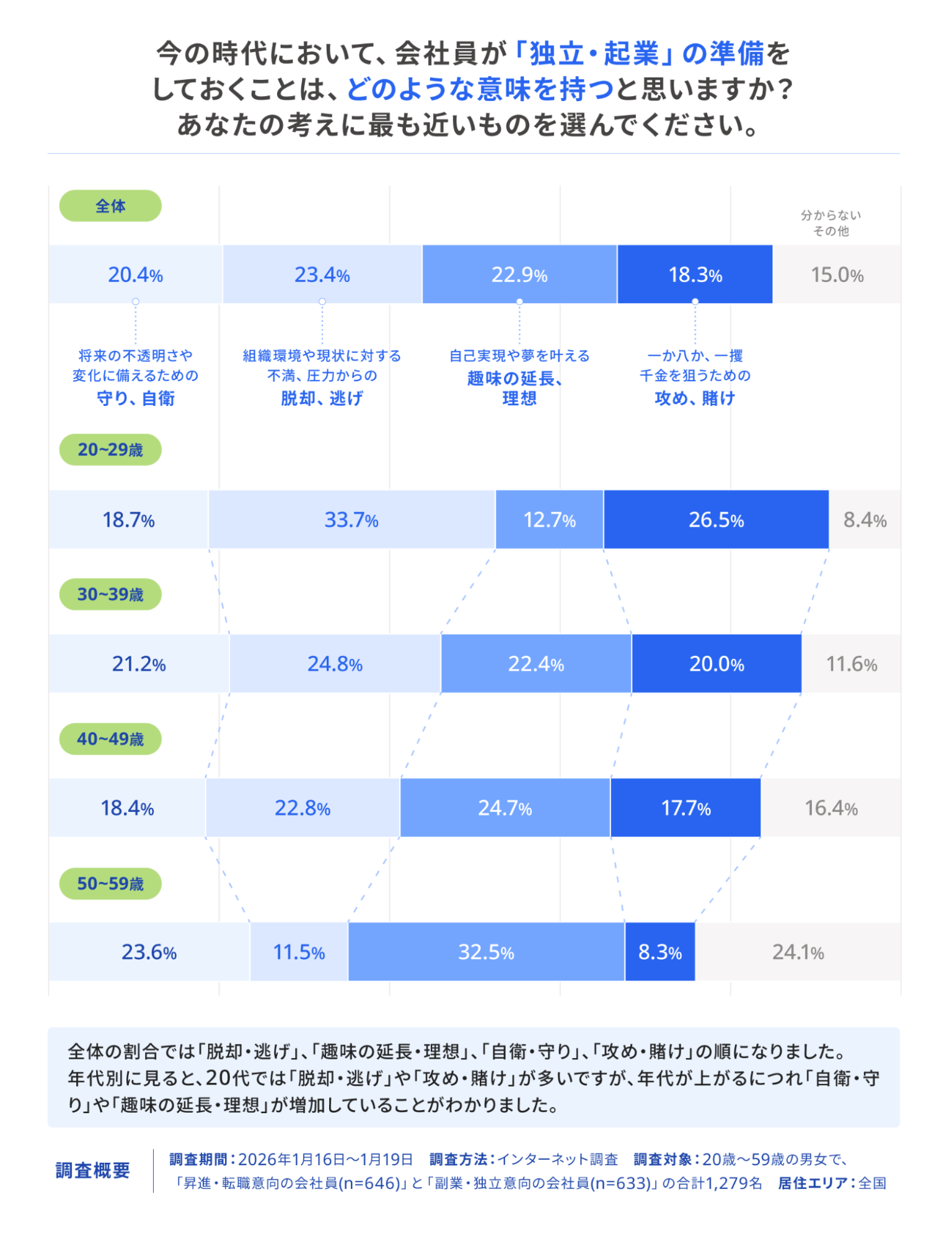 「今の時代において、会社員が独立・起業の準備をすることの意義」を年代別に調査したところ、年代が上がるにつれて「守り・自衛」や「趣味の延長・理想」といった回答の割合が増加し、逆に「脱却・逃げ」や「攻め・賭け」は減少する傾向が見られました。