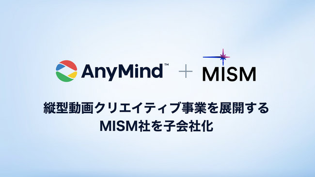 AnyMind Group株式会社(読み:エニーマインドグループ、代表取締役CEO:十河 宏輔、以下「当社」) は、、縦型動画広告に特化したクリエイティブ制作事業を展開する株式会社MISM(読み:ミズム、代表取締役:羽部 千織、以下「MISM社」)の全株式を取得し、子会社化したことをお知らせします。