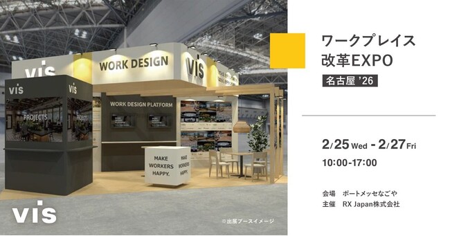 『ワークデザイン』を手がける株式会社ヴィス(本社:東京都港区、代表取締役社長:金谷智浩)は、2026年2月25日~27日にポートメッセなごや(名古屋市港区)で開催される「ワークプレイス改革EXPO」に出展します。