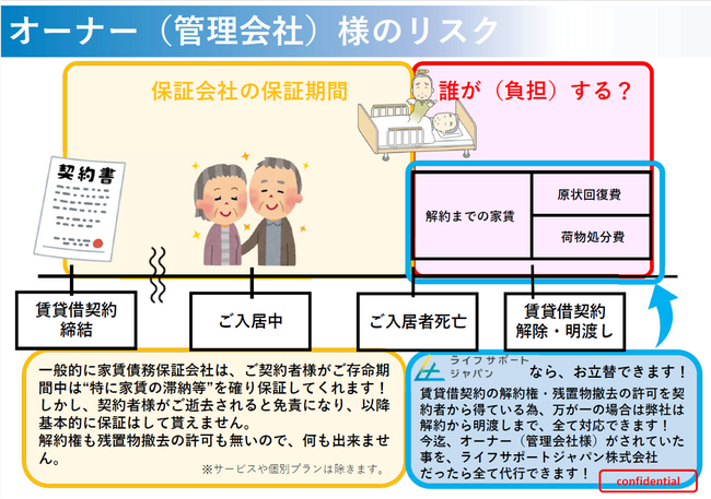 賃貸運営の課題は、家賃の保証だけで完結しない時代に入っていると考えます。不動産管理会社の現場が直面する、法律上の理由で保証会社では保証しきれない“万一の実務”までを設計に落とし込み、契約者様・管理会社様・オーナー様の安心を高める連携を進めてまいります。また、 見守りと死後事務は、現場で起きてから対応するのではなく、入居時点で備えることで効果を発揮します。家賃保証の仕組みと連携することで、管理会社様が導入しやすい標準形として社会実装を加速させます。