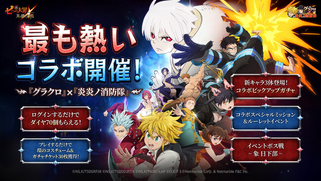 ネットマーブルは、スマートフォン向けシネマティックアドベンチャーRPG『七つの大罪 ~光と闇の交戦(ひかりとやみのグランドクロス)~』(略称:グラクロ)において、1月29日(木)に、コラボキャラ【炎炎ノヒーロー】 森羅 日下部、【紅炎の猫又】 環 古達、【凍りついた時間】 象 日下部が登場する「『グラクロ』×『炎炎ノ消防隊』コラボ」を開催することをお知らせいたします。