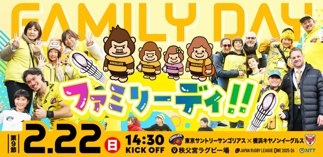 東京サントリーサンゴリアスは、2026年2月22日(日)に秩父宮ラグビー場にて開催される「NTT JAPAN RUGBY LEAGUE ONE 2025-26 第9節 横浜キヤノンイーグルス戦 東洋製罐グループ プレゼンツ」にて「ファミリーデイ」のイベント詳細を公開いたしました。