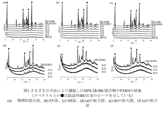 密封加熱法(SH法)により、イブプロフェン(IBU)をメソポーラスシリカ(MPS)に担持することで、IBUの非晶質化および溶解度の向上に成功しました。