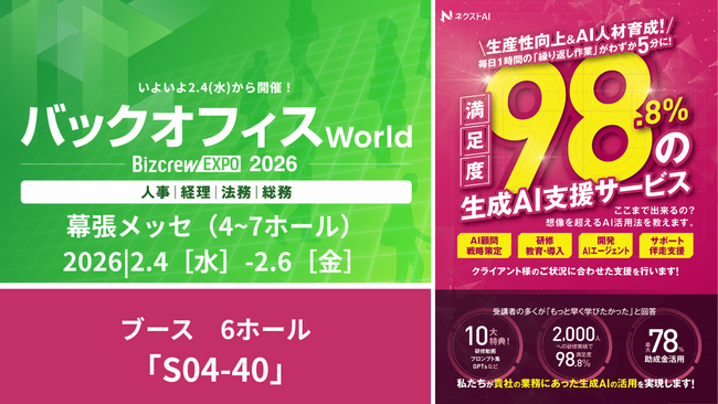 生成AI支援サービス『ネクストAI』を提供する株式会社カトルセ(本社/東京都中央区、代表取締役/橋本健太郎)は、2026年2月4日(水)~6日(金)に幕張メッセで開催される「バックオフィス World」に出展します。
