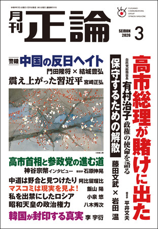 日本の針路を問う論壇誌、月刊「正論」3月号(産経新聞社発行)を1月30日に発売しました。最大の注目は、2月8日投開票の衆院選後の保守政治の展望です。自民党の有村治子氏が高市早苗首相による長期政権への期待を語るほか、日本維新の会の藤田文武共同代表や参政党の神谷宗幣代表が登場し、保守勢力の在り方を提示しています。経済政策「サナエノミクス」の行方を歴史的視点から分析する対談も必見です。外交・安全保障では、飯山陽氏による国際秩序の崩壊への警鐘や、小泉悠氏によるロシアの継戦能力分析など、日本の命運を左右する論考が並びます。