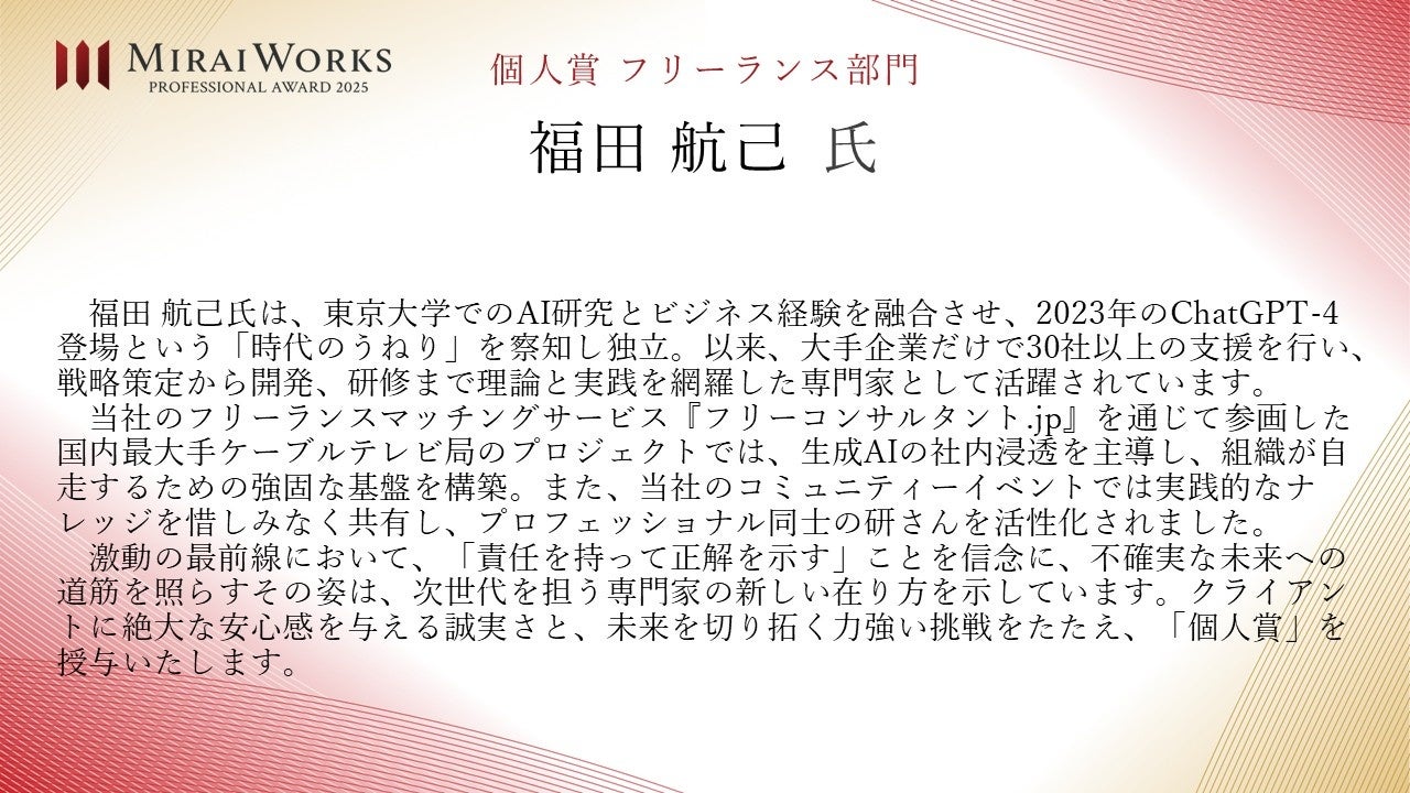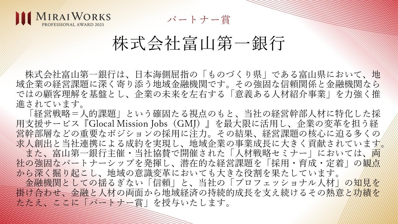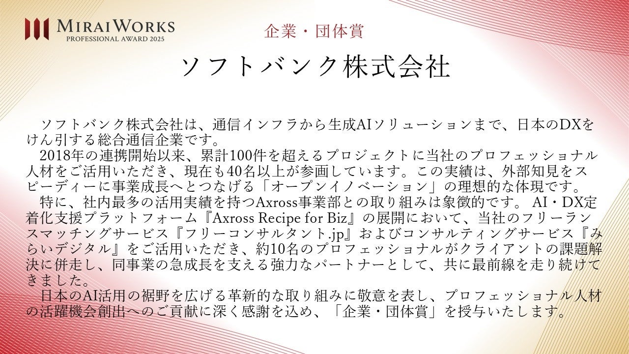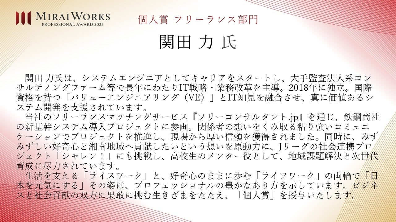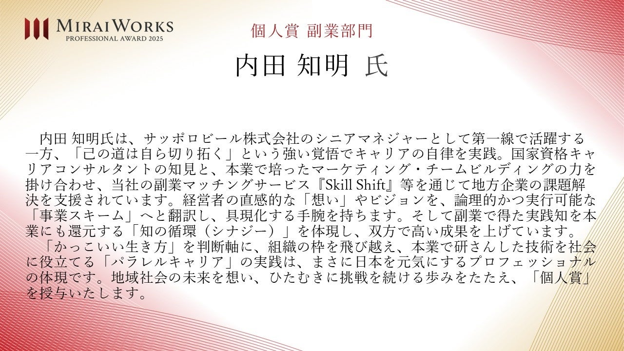 株式会社みらいワークス(本社:東京都港区、代表取締役社長 岡本祥治、以下「当社」)は、「プロフェッショナル アワード」の2025年受賞者を決定し、授賞式を執り行いましたことをお知らせいたします。