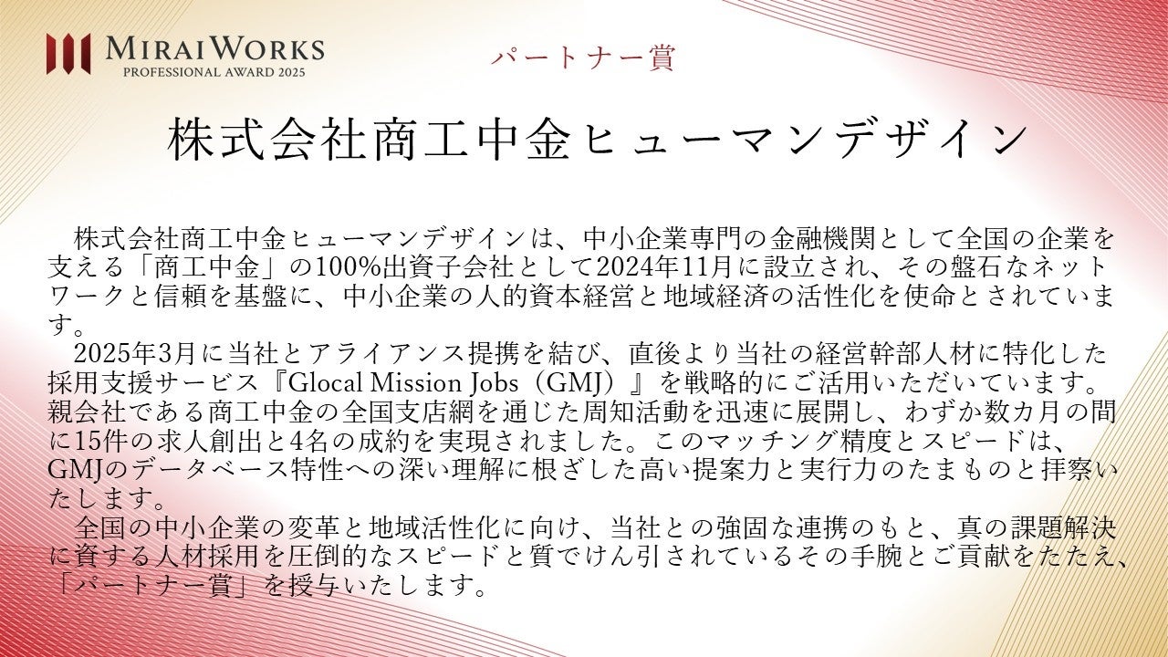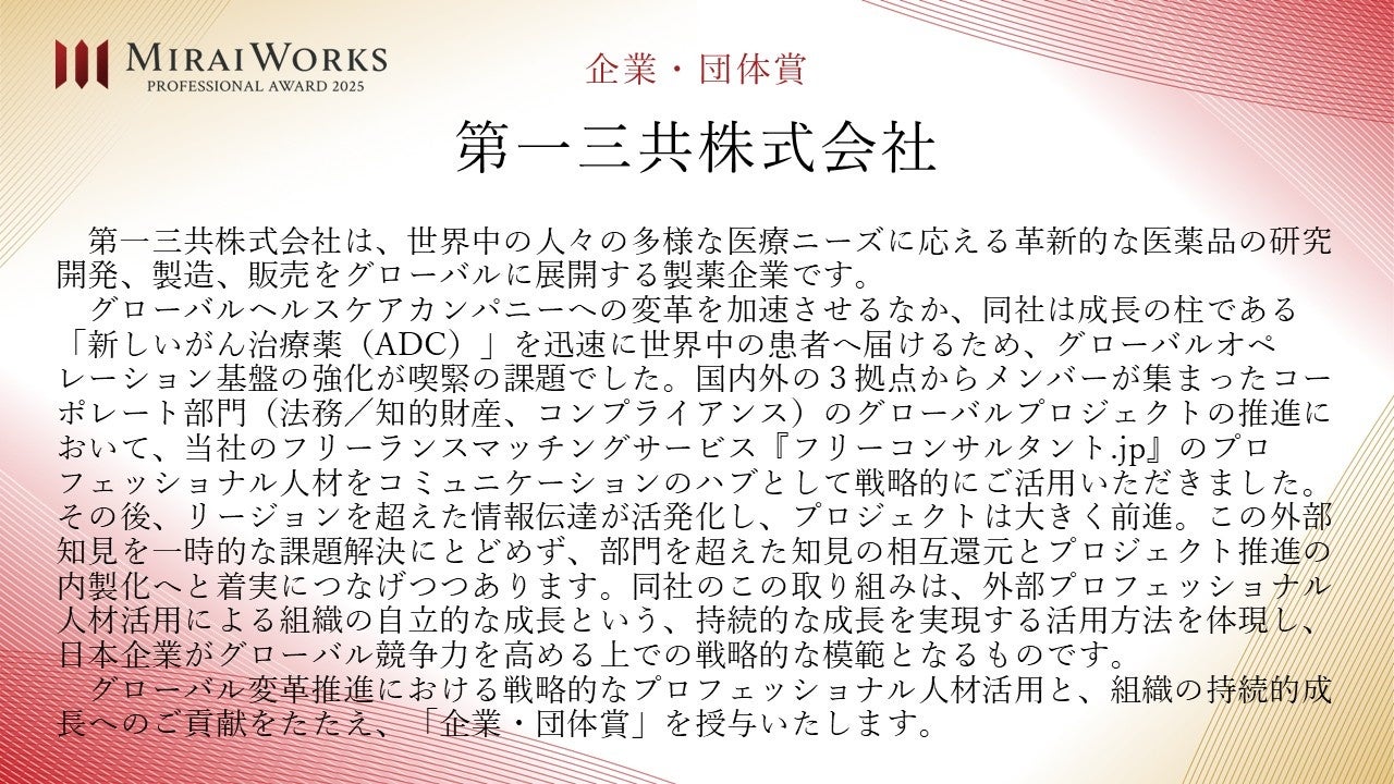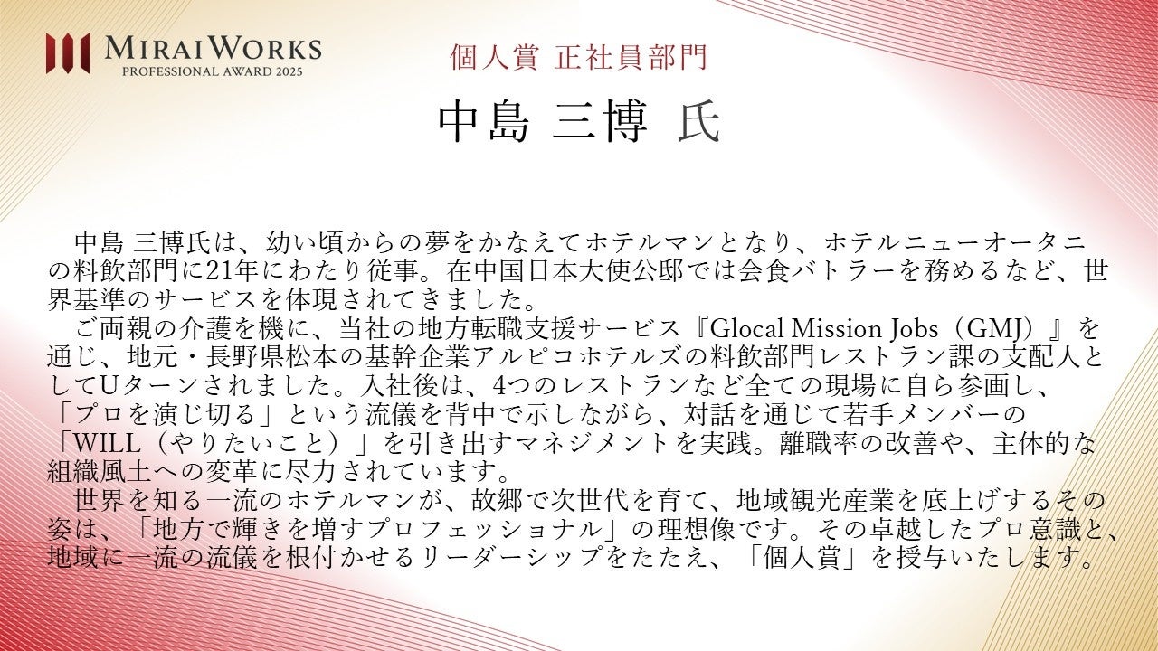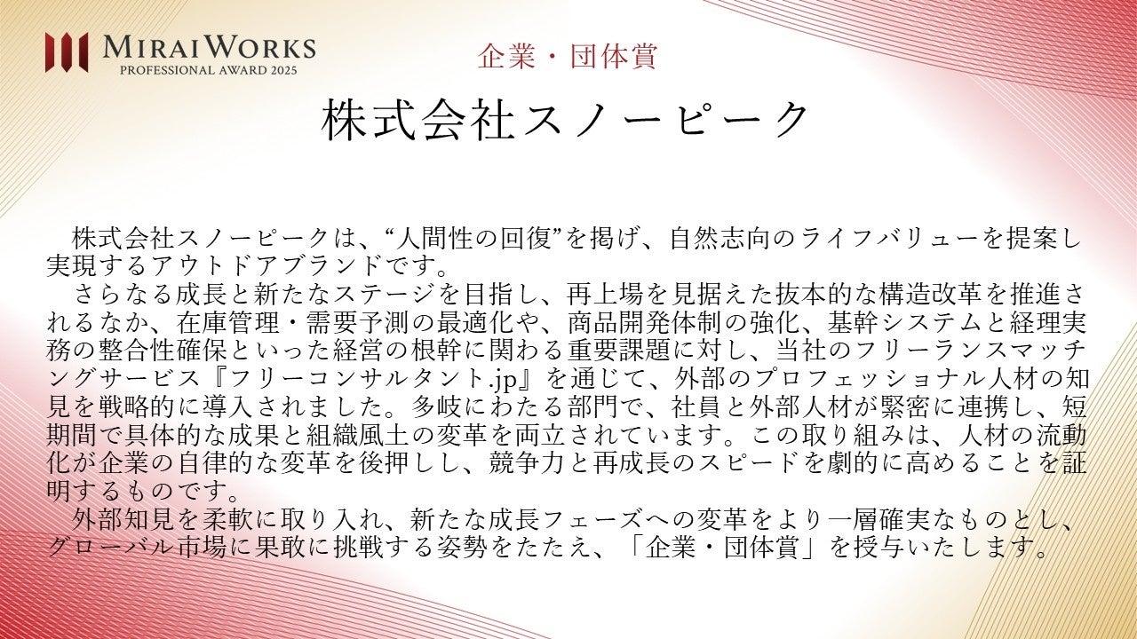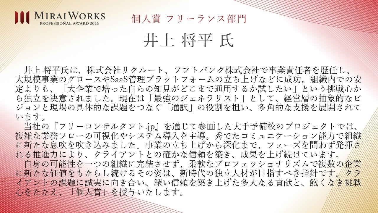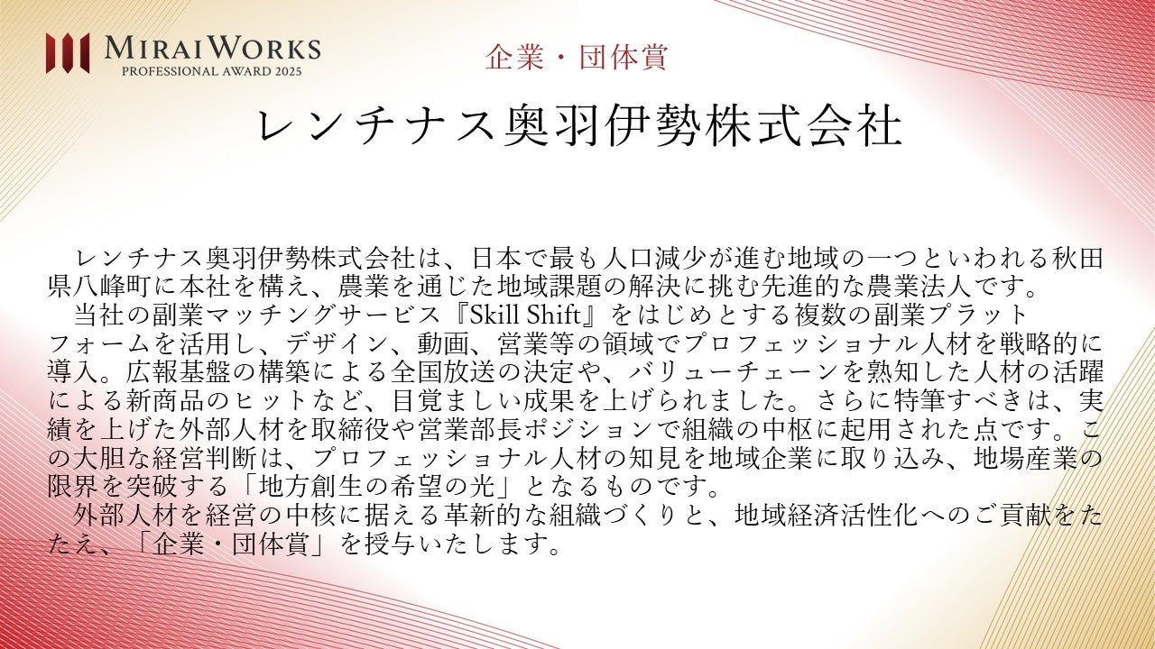 株式会社みらいワークス(本社:東京都港区、代表取締役社長 岡本祥治、以下「当社」)は、「プロフェッショナル アワード」の2025年受賞者を決定し、授賞式を執り行いましたことをお知らせいたします。