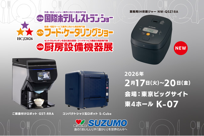 鈴茂器工株式会社(本社:東京都中野区、代表取締役社長:谷口徹)は、2026年2月17日(火)から20日(金)に東京ビッグサイトで開催される第54回 国際ホテル・レストラン・ショー(以下 HCJ2026)に出展いたします。鈴茂器工ブースは【東4ホール K-07】です。
