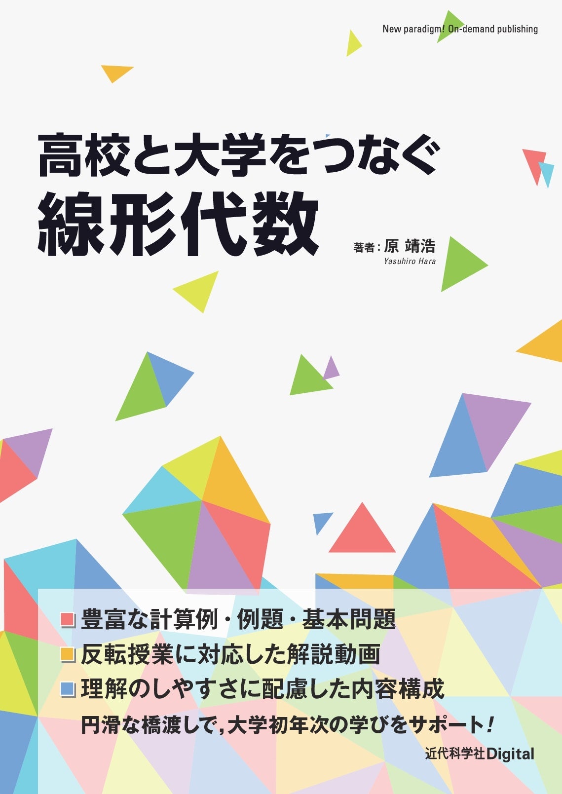 本書は、高校から大学への橋渡しを意識しつつ作成したものです。 多くの定理に証明を与え、従来の大学数学の教科書的な側面を備える一方で、高校の教科書のように計算例・例題・基本問題を多く配置し、 大学初年次における学習のしやすさに配慮しました。さらに、本書は従来型の講義を反転授業に展開するために用意した教材です。反転授業とは、 解説動画によって予習を行い、授業時間には演習を中心に進める形式です。そのため、本書には対応する解説動画を併せて用意しています。