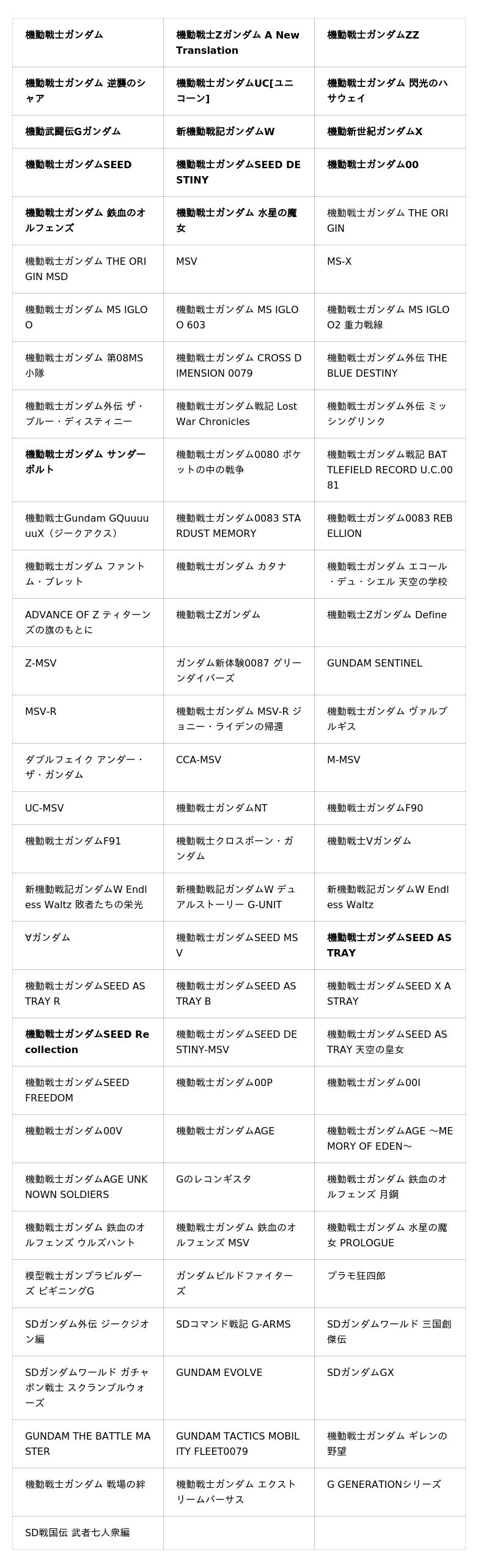 ※太字はメインステージ及び、ヒストリーステージとしてシナリオが収録されている作品です
