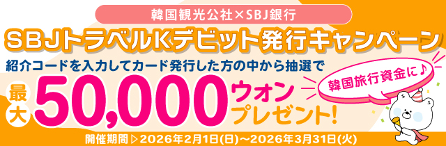 【韓国観光公社とのコラボキャンペーン!!最大50,000ウォンが当たるチャンス!!】「韓国観光公社×SBJ銀行 SBJトラベルKデビット発行キャンペーン」実施(条件達成者の中から抽選で当たる!)