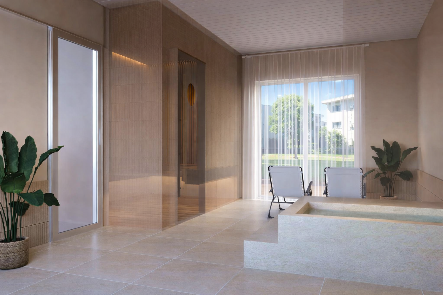 仕事や趣味に集中する「書斎」としてのワークスペース、心身を整える「離れ」のようなサウナを専有空間の外に備えることで、広々とくつろげる健やかな暮らしを提案します。