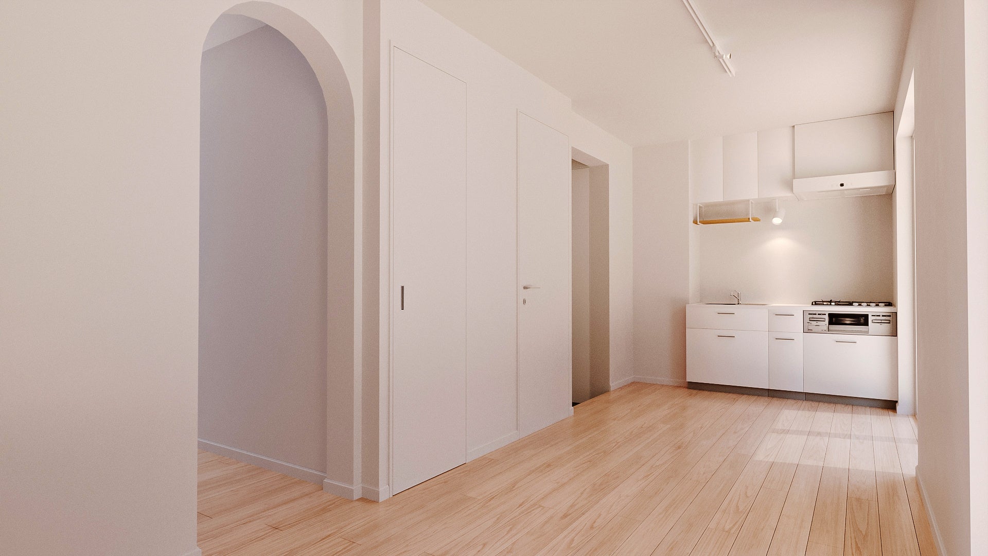 各住戸は1LDKながら、二人暮らしでも心地よく過ごせる空間をつくります。約10帖のLDKと独立した約4帖の寝室には、天然無垢のフローリングを採用し、白を基調とした明るくシンプルな内装を施します。さらに、両室間にはアーチ開口を取り入れ、空間を柔らかくつなぎます。人工大理石天板のシステムキッチンには、広々とした作業スペースと3口コンロを備え、料理を心ゆくまでお楽しみいただけます。また、バス・トイレ・洗面台をそれぞれ独立させることで、快適で使い勝手の良い生活動線を実現します。