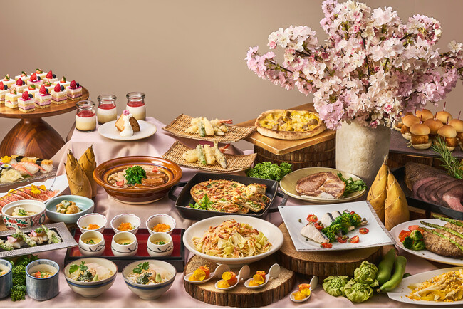 アスパラガスと新玉葱のペペロンチーノ/蒸し鶏 そら豆ディップ/イカと菜の花の梅肉ソース/炙り水ダコ/ポークピカタ トマト味噌ソース/春野菜と桜海老のフリッタータ/山菜ピラフ/あさりと筍の白蒸し貝だし仕立て/京丹波高原豚と新玉ねぎの出汁しゃぶポン酢あん/都ホテル&リゾーツカレー/味噌汁京桜味噌仕立て/赤魚の九条ねぎ味噌焼きと春色野菜白扇揚げ /揚げたこ焼き/ローストビーフ/フィッシュバーガー/シラスと九条ねぎのピッツア/オニオンブルーテパスタ/さくら散らし寿司(平日限定)/天ぷら/鶏ガラ仕立て昔ながらの醤油ラーメン/にぎり寿司(土日祝限定)