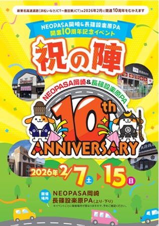 中日本エクシス株式会社 中部支店(愛知県豊田市、支店長・小口(おぐち) 知英(ともひで))は、E1A 新東名高速道路(新東名) NEOPASA(ネオパーサ)岡崎(集約、愛知県岡崎市)および、長篠設楽原パーキングエリア(PA)(上下線、愛知県新城市)にて、開業10周年を記念して、お客さまへこれまでのご愛顧に感謝を込めた「NEOPASA岡崎・長篠設楽原PA 開業10周年記念イベント『祝の陣』」を開催します。