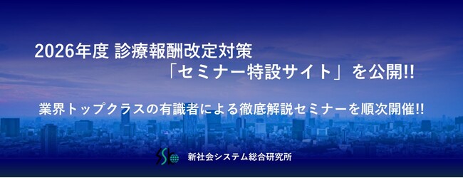 ビジネスセミナーを年間500回手掛ける株式会社新社会システム総合研究所(SSK)は、2026年度(令和8年度)診療報酬改定対策のため、「診療報酬改定セミナー特設サイト」を開設いたしました。医療業界のトップクラスの有識者を講師に迎え、病院関係者や製薬・ヘルスケア企業の担当者を対象に、激変する医療環境に勝ち抜くための具体的な方策を提示します。
