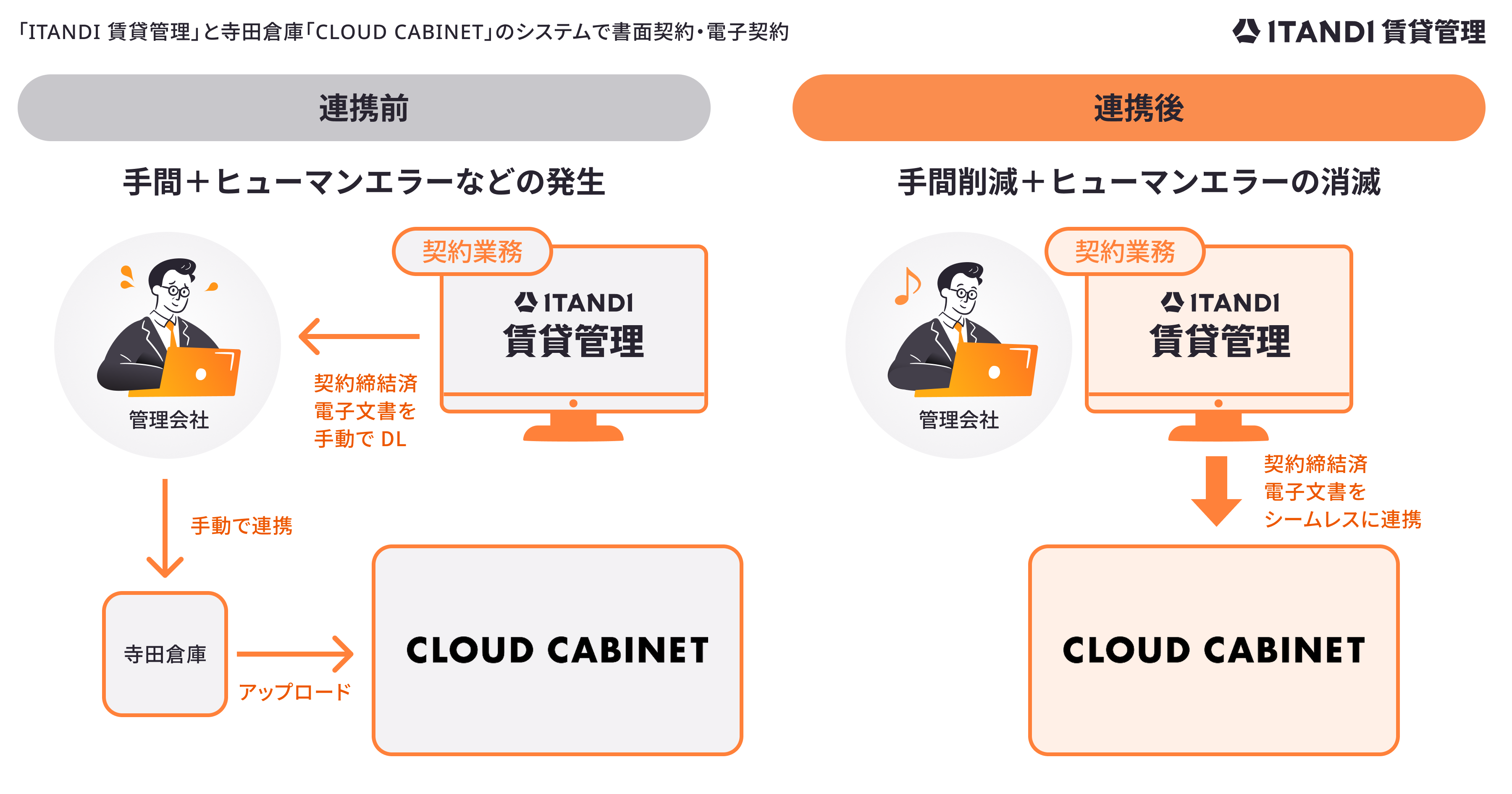 コスモスイニシア、イタンジ「ITANDI 賃貸管理」の電子契約データと寺田倉庫「CLOUD CABINET」の連携を開始