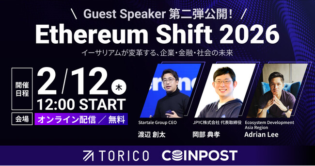 株式会社TORICO(本社:東京都千代田区、代表取締役社長:安藤拓郎、以下「当社」)は、Web3に関するメディア事業・イベント事業を展開する株式会社CoinPost(本社:東京都千代田区、代表取締役:各務貴仁、以下「CoinPost」)と共催で開催するオンラインイベント「Ethereum Shift 2026」に関し、第二弾登壇ゲストおよび当該ゲストが登壇するセッション内容を公開するとともに、既存のメディアパートナーに加え、新たに「NADA NEWS」がメディアパートナーとして参加決定いたしましたので、お知らせいたします。