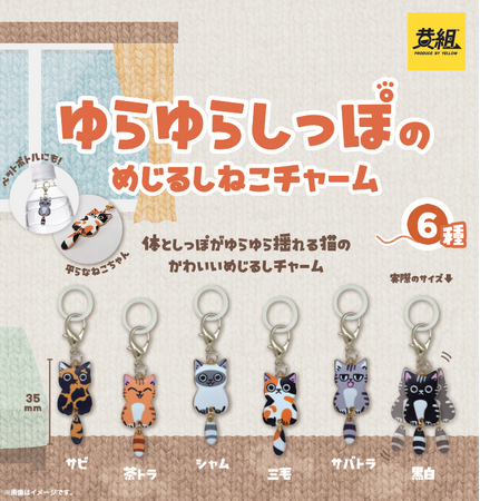 6種類の豊富なバリエーションで、好きな猫がきっと見つかる! 実用性も高い、流行のめじるしチャーム『ゆらゆらしっぽのめじるしねこチャーム』 がカプセルトイに登場。