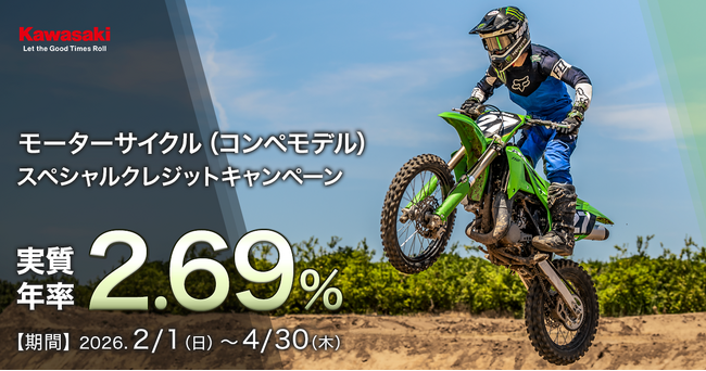 株式会社カワサキモータースジャパン(本社:兵庫県明石市、代表取締役社長:佐伯 健児)は、2026年2月1日(日)より、全国のカワサキ正規取扱店でコンペティションモデルの新車をご購入時に、実質年率2.69%でクレジットをご利用いただける「コンペモデルスペシャルクレジットキャンペーン」を実施いたします。